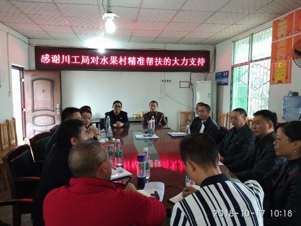 2018年10月17日,在我國第五個“扶貧日”之際,工程局黨委副書記、工會主席代勇率局黨辦主任、勞動人事處處長夏永紅、工會副主席付麟麗、辦公室副主任周勝一行,赴資陽市安岳縣千佛鄉水果村開展精準扶貧捐贈活動。千佛鄉黨委書記呂麟熙、鄉長張軍、副書記丁飛鷹、人大主席楊剛、副鄉長羅朝暉,工行安岳支行副行長唐永宏等相關負責人及水果村“兩委”班子成員、各社社長、駐村工作隊隊員參加了捐贈活動。