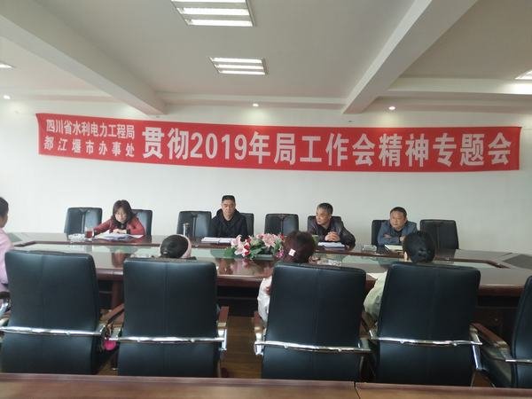 2019年4月12日,局都江堰市辦事處召開職工大會,傳達貫徹工程局2019年工作會議精神。會議由局都江堰市辦事處黨支部書記孫代華主持。