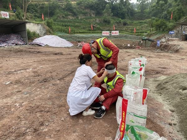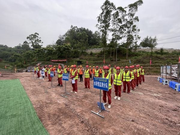 演練模擬場景為自貢市榮縣全面進入主汛期,榮縣境內發生強降雨,有可能發生山洪、泥石流、坍塌等自然災害,將危及瓦店子提灌渠2#隧洞出口作業面安全,演練按照突發事件、預測預警、應急響應,涉險人員、設備安全撤離,突發事件應急處置等內容進行實戰演練。