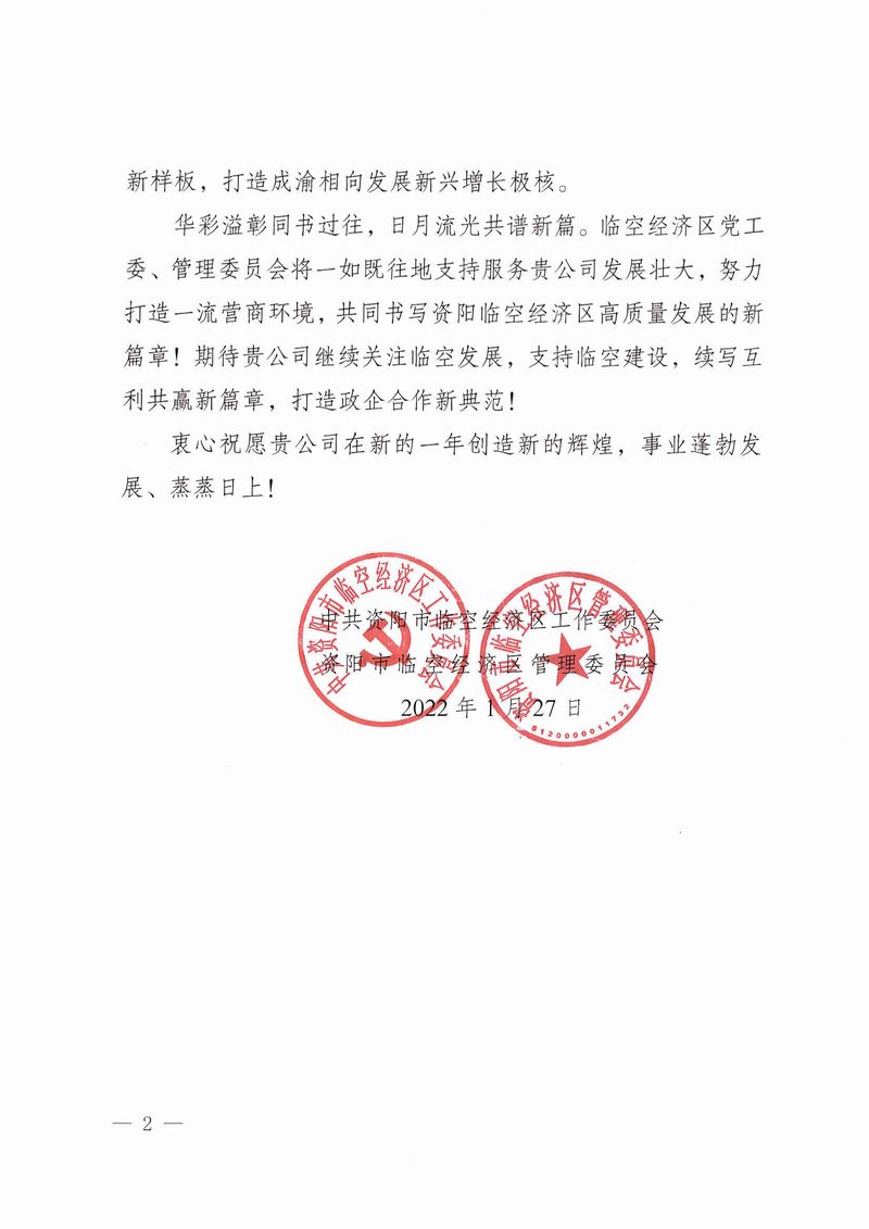 資陽(yáng)市臨空經(jīng)濟(jì)區(qū)管理委員會(huì)致公司感謝信