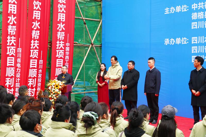 德格縣縣委書記昌呷次稱在講話中代表縣委、縣政府以及德格縣父老鄉親向蒞臨出席活動及關心德格縣發展的領導、來賓表示衷心的感謝和崇高的敬意。他強調,水發集團堅決貫徹省委部署要求,傾注真情實感、投入真金白銀、用力真幫實扶,不斷為鞏固拓展脫貧攻堅成果、全面助推德格縣鄉村振興注入新動力。下一步,期望各方進一步加強工作統籌、力量統籌和資源統籌,攜手構建高質量發展共同體,讓愛心永放光芒、讓真情共筑希望,共同譜寫德格縣高質量發展新篇章;最后,熱烈祝賀并宣布德格縣包裝飲用水幫扶項目封頂儀式圓滿禮成。