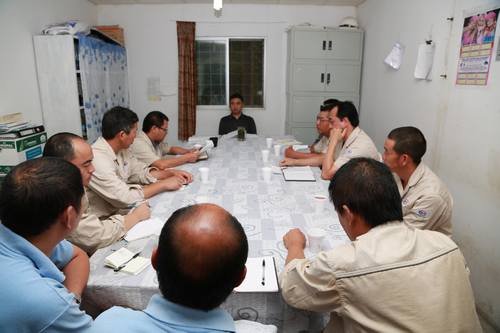 聽取匯報后,鄔清富局長首先代表工程局、局黨委向戰(zhàn)斗在遙遠的異國他鄉(xiāng)的廣大職工和配屬人員表示親切慰問。他對TP項目部前期的工作給予充分肯定,同時,就今后的工作向項目部提出了三點要求:1、狠抓安全、質量、進度、環(huán)保工作,注意安全生產(chǎn),不能麻痹大意,進一步提高砼質量及外觀工藝,倒排工期,確保在2015年12月底合同工期內(nèi)順利完工;2、認真研究合同,準備資料,抓好結算;3、加強項目管理,加強人、材、物的管理,及時總結涉外施工管理經(jīng)驗。最后,鄔局長要求項目部、局工會要大力宣傳職工的愛崗敬業(yè)奉獻精神,進一步關心涉外職工生活,努力幫助解決實際困難,切實讓職工感受到組織的關懷。
