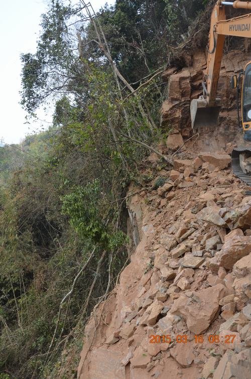 我局承建的老撾南桑3級(jí)進(jìn)場(chǎng)公路工程位于老撾華潘省境內(nèi),公路全長(zhǎng)3596.004m,工程建設(shè)期為4個(gè)月,在老撾雨季前必須完成所有施工任務(wù)。承擔(dān)建設(shè)任務(wù)的第四工程處組織精干力量,于2015年1月24日迅速組織首批人員進(jìn)場(chǎng),并緊急抽調(diào)我局原老撾色薩拉龍灌溉項(xiàng)目停留機(jī)械設(shè)備共23臺(tái)套,組織中方及老撾本地員工35人于2月7日開始進(jìn)行主體工程施工,由于工程合同簽訂時(shí)未對(duì)施工現(xiàn)場(chǎng)進(jìn)行勘查,僅僅依靠設(shè)計(jì)圖紙進(jìn)行綜合考慮,在實(shí)際施工過程中遭遇到諸多困難:一是設(shè)計(jì)軸線與實(shí)際地形差異較大,沿線山體陡峭,沖溝及陡崖沿線分布較多,許多開挖地段山體傾角呈70—80度甚至局部呈90度,作業(yè)人員難以在山坡立足,沿線多出現(xiàn)陡崖、沖溝等斷頭及懸空現(xiàn)場(chǎng);二是開挖高度較高,最高開挖高度超過45米,其他開挖高度大多在10米以上,而且山體覆蓋層較薄, 90%為基巖,挖機(jī)在開挖過程中難以形成有效的可操作平臺(tái),必須邊開挖邊爆破再開挖,并及時(shí)處理高邊坡處危巖方可再前進(jìn),局部地段只能采取液壓鉤機(jī)作業(yè)才能保證挖機(jī)繼續(xù)前進(jìn);三是巖石堅(jiān)硬、節(jié)理及裂隙發(fā)育,鉆爆難度較大,打鉆常有卡鉆現(xiàn)象,部分地段只能采用液壓鉤機(jī)開挖;四是開挖作業(yè)面狹窄單一,由于道路軸線大多沿山體中部前進(jìn),無法開展多點(diǎn)施工作業(yè)面,只有采取一臺(tái)挖機(jī)單向開挖毛坯路,而后另一臺(tái)挖機(jī)隨后再進(jìn)行降高處理,降高過程中挖機(jī)需要進(jìn)行多次翻甩作業(yè),增加了施工作業(yè)程序,因此施工過程十分困難;五是由于該項(xiàng)目地處老撾原始森林未開發(fā)地帶,山體植被豐富茂密,樹木粗大密集,挖機(jī)在開挖過程中遇粗大樹木無法直接挖除時(shí),必須采取鋼絲繩牽拉、人工鋸除甚至個(gè)別極其粗大樹木只有采取爆破作業(yè)才能保證開挖作業(yè)正常進(jìn)行。六是工程所需炸材手續(xù)因老撾國(guó)家程序較繁瑣,辦事效率較低,嚴(yán)重影響工程進(jìn)度。加上老撾當(dāng)?shù)匚镔Y匱乏,許多工程配件需要國(guó)內(nèi)發(fā)送,其發(fā)送周期較長(zhǎng)影響工程進(jìn)度。