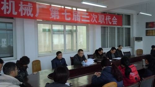 2015年12月10日下午,機械廠第七屆三次職工代表大會召開,22位職工代表到會,工會主席諶洪嵋主持會議。會議向與會代表們報告了機械廠2014年10月至2015年10月期間的生產經營情況、財務收支情況、生產一線勞保福利發放、業務招待費用、領導工資收入等廠務公開內容。